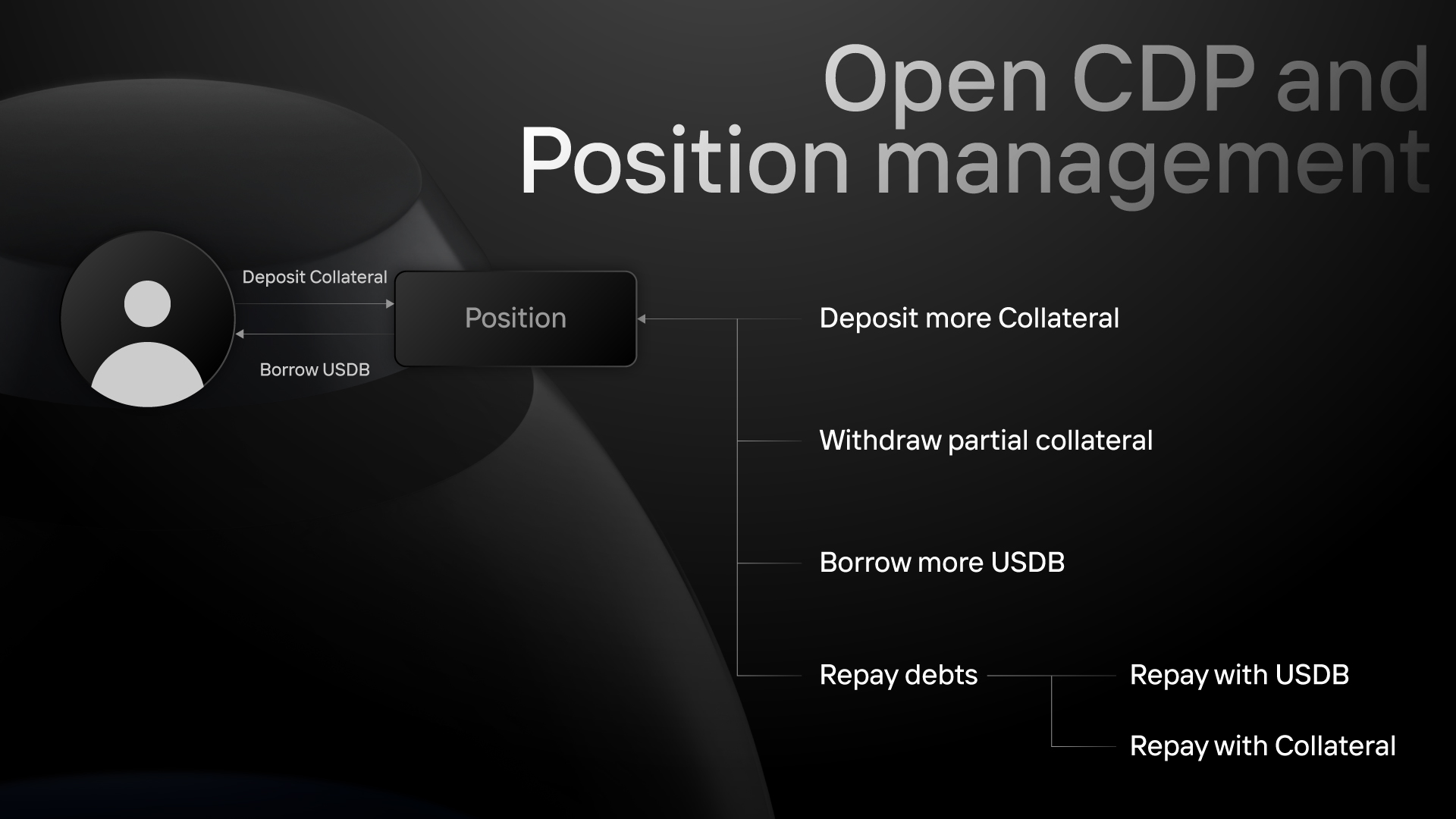 * **Open position** - Create a CDP by depositing supported collateral then borrow USDB.
