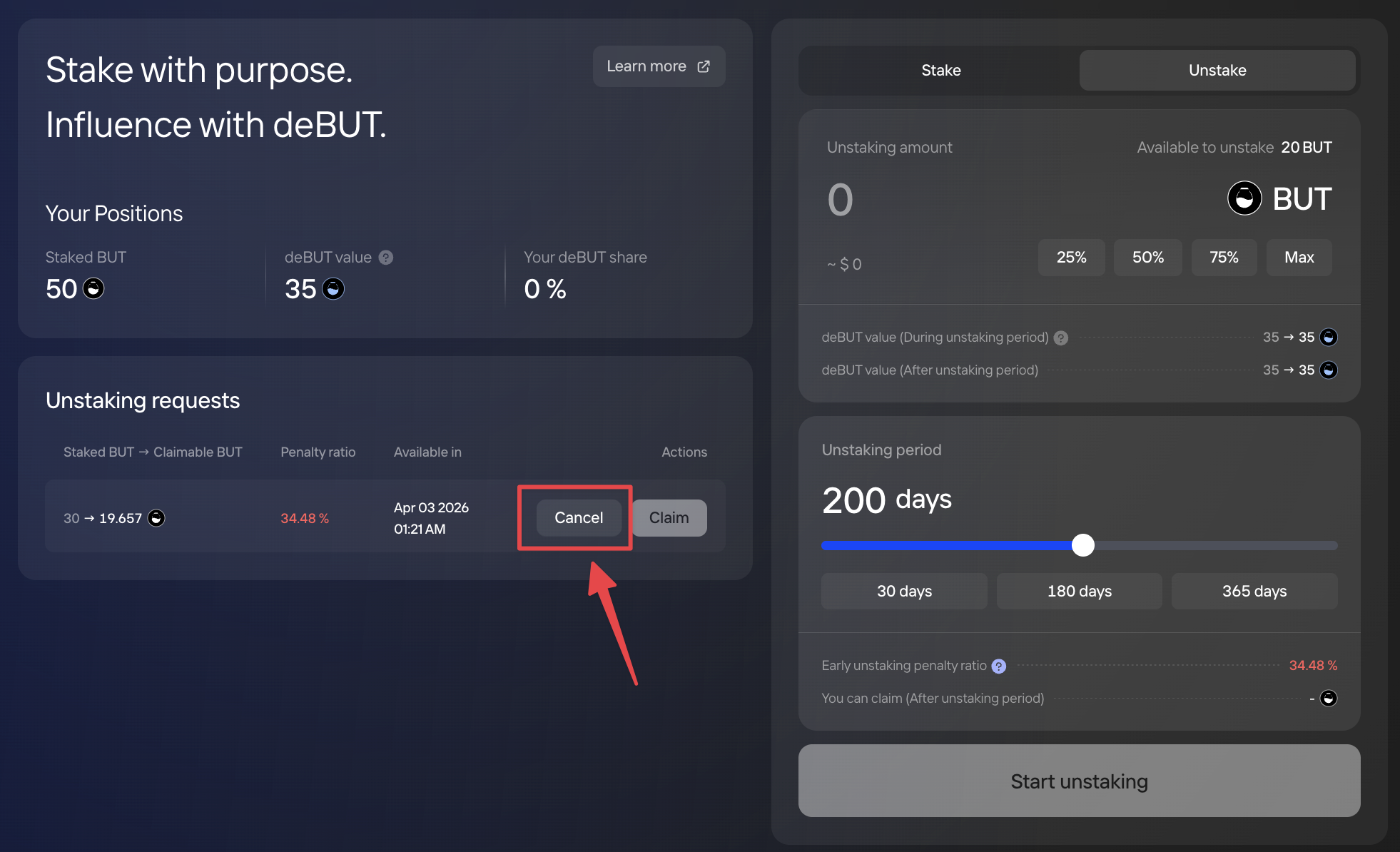 * If you **cancel** before completion: stake returns to **100 BUT** and **deBUT weight = 100** (1:1).